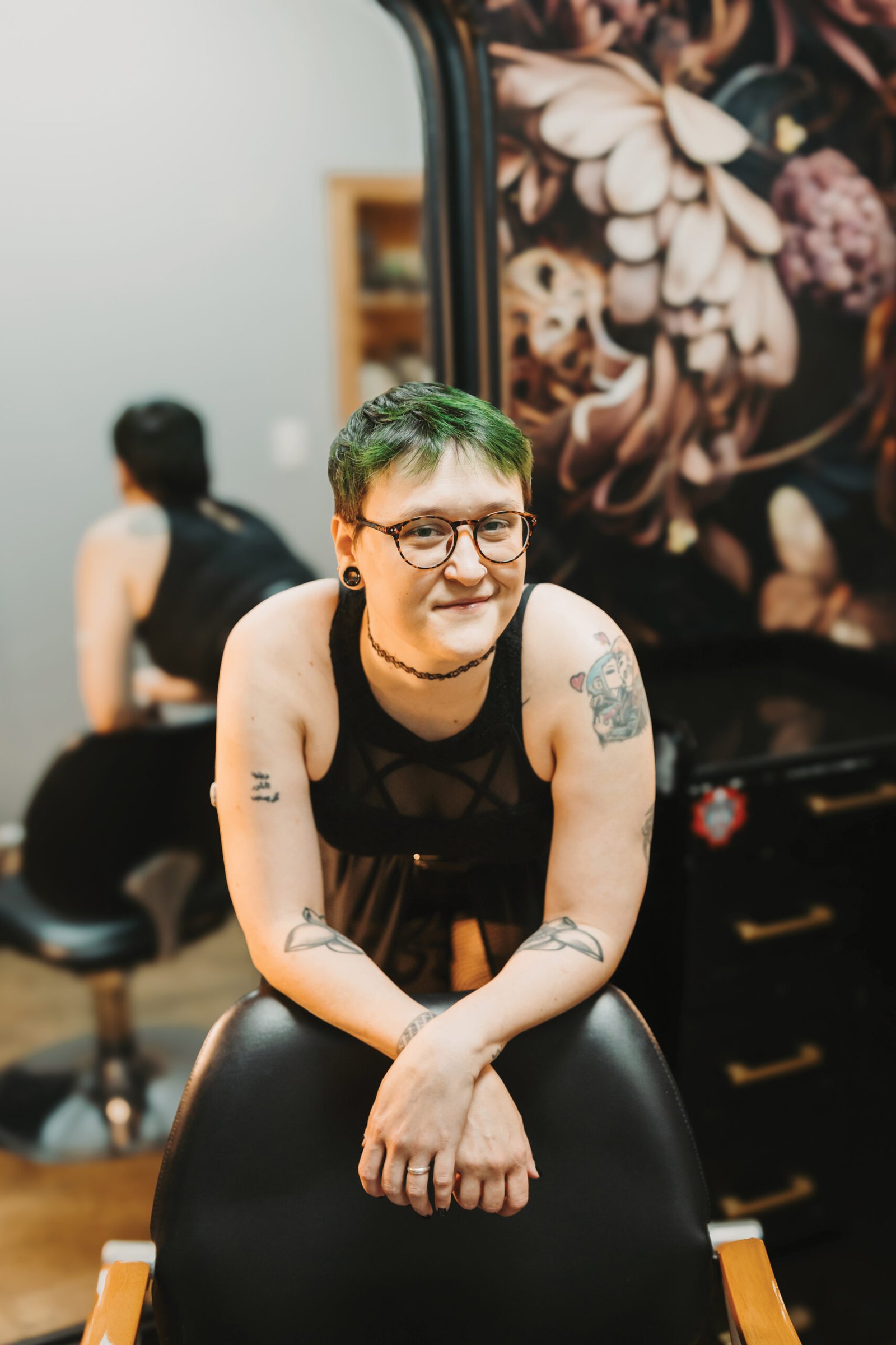 “When I’m not behind the chair, I’m an anime lover surrounded by my three chaotic angels (cats), and my days are often soundtracked by The Crane Wives, David Bowie, Stevie Nicks, or Slaughter Beach, Dog. I’m also a big crafter at heart if I’m not doing hair, I’m probably crocheting something whimsical, or weird (and yes, you can find my handmade creations for sale in the shop!). All the things I love outside the salon inspire the creativity, color, and personality I bring to every client I work with.”